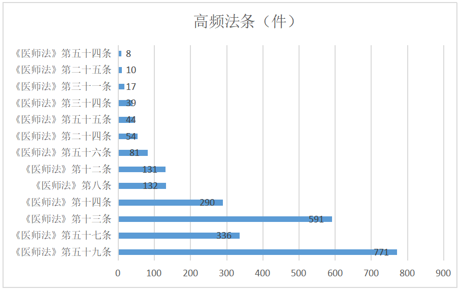 从图3可知,《医师法》适用的高频法条主要是针对非医师行医,未按照执业地点、类别和范围执业,医师未履行诊疗注意义务和告知义务,医师未履行执业管理职责和职业道德。其中,以非医师行医为例,有准入条件、禁止行为和法律责任条款,其中准入条件涉及《医师法》第八条、第十二条,即通过医师资格考试,取得医师资格证书;禁止行为涉及《医师法》第十三条规定,需完成执业注册,取得医师执业证书,未取得医师执业证书,不得从事医师执业活动。违反《医师法》第十三条的法律后果,则适用《医师法》第五十九条进行规制,即责令停止非法执业活动,没收违法所得和药品、医疗器械,并处违法所得二倍以上十倍以下的罚款,违法所得不足一万元的,按一万元计算。