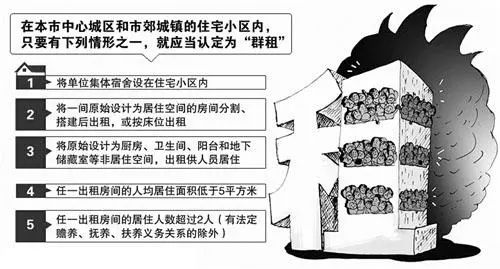 2014年,上海市综治办、市高院、市住房保障房屋管理局、市公安局等十部门曾联合发布《关于加强本市住宅小区出租房屋综合管理的实施意见》,并同步修订了《上海市居住房屋租赁管理办法》。其中就明确了“群租”如何界定,即在上海市中心城区和市郊城镇的住宅小区内,只要有将单位集体宿舍设在住宅小区内、将一间原始设计为居住空间的房间分割、将原始设计为非居住空间出租供人员居住、任一出租房间的人均居住面积低于5平方米等等情形之一的,就是群租。