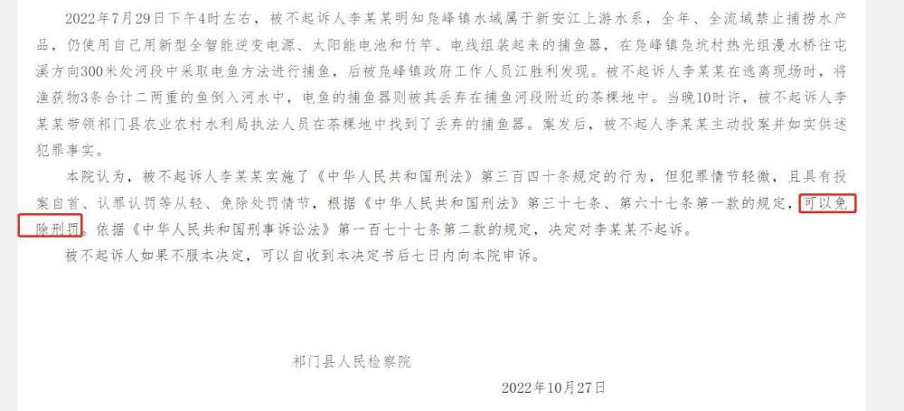 记者同时注意到,去年10月,安徽祁门县一名男子李某某同样在禁渔期禁渔区内使用新型全智能逆变电源、太阳能电池和竹竿、电线组装起来的捕鱼器捕了3条鱼,被当地公安机关抓获,后取保受审。不过,祁门县人民检察院最终决定不起诉。
