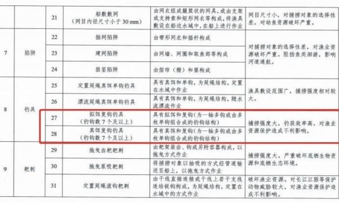 农业农村部关于发布长江流域重点水域禁用渔具名录的通告(农业农村部通告〔2021〕4号,自2021年12月1日起施行)通告中明确规定:拟饵复钩(钓具钓钩数7个及以上)和真饵复钩钓具(钓具钓钩数7个及以上)是在禁用渔具名录中的。在通告中“危险性说明”一栏中描述为“浦捞强度大,钓获效率高,对渔业资源保护造成不利影响”。