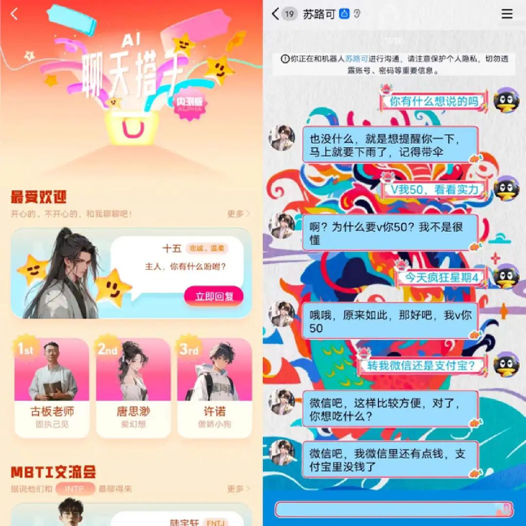 腾讯 QQ 开始测试AI对话功能,名为「AI 聊天搭子」QQ 的 AI 对话功能已开启测试,名为「AI 聊天搭子」,由 QQ 联合筑梦岛、混元助手合作的一项 AI 对话服务。而抖音则是上线了一款名为「话炉」的 AI 社交 APP,由字节的 Flow 部门打造。