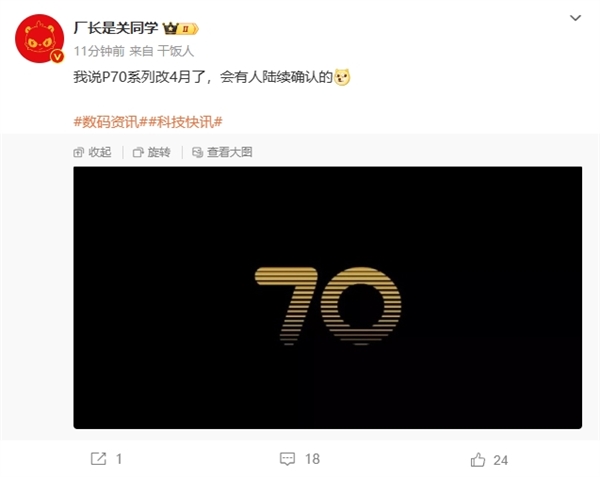 据知名数码博主 @ 厂长是关同学 最新发布的信息显示,与此前传闻的华为 P70 系列将定档 3 月中下旬发布的爆料不同,P70 系列发布会将延期到 4 月份,后续会有人陆续确认,具体原因暂时不详。至于具体是 4 月什么时间段,该博主也没有指出来。不过结合此前相关爆料,此次延期可能与该机的核心处理器以及影像方面的升级有关。据悉,该机将全系标配麒麟 9000S 处理器、全系标配 5000 万像素超大底主摄、全系标配潜望式长焦镜头、全系标配卫星通信技术等。