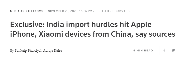 两名知情人士告诉路透社,印度政府此举原是严格控制来自中国的电子产品,但却影响了苹果公司新型iPhone手机的进口,导致新发售的iPhone 12在上个月遭遇通关延误。目前,苹果印度公司高管呼吁印度标准局加快审批速度,并保证公司将继续扩大在印度的组装业务。