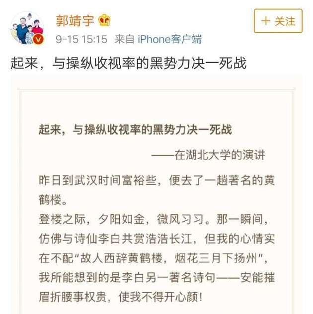 ▲电视剧导演郭靖宇实名举报其执导的电视剧遭遇收视率“黑幕”(图/微博)