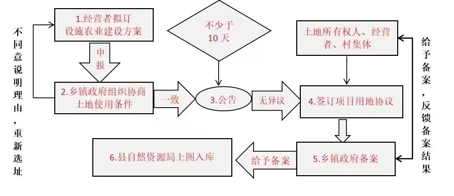 3.用地协议。农业生产经营者与集体经济组织进行协商并签订用地协议。协议内容包括:用地面积、土地用途、使用年限、双方的权利和义务、违约责任、争议解决方式等内容。涉及土地承包经营权流转的,应依法签订流转合同。