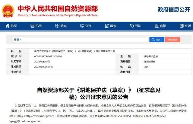 2022年9月5日,自然资源部官网发布公告,公开征求《耕地保护法(草案)》(征求意见稿)意见。据起草说明,《耕地保护法(草案)》初稿起草后,自然资源部先后征求了省级自然资源主管部门、农业农村部等有关中央和国家机关的意见, 并听取了部分专家学者的意见。在此基础上,修改形成了草案征求意见稿。