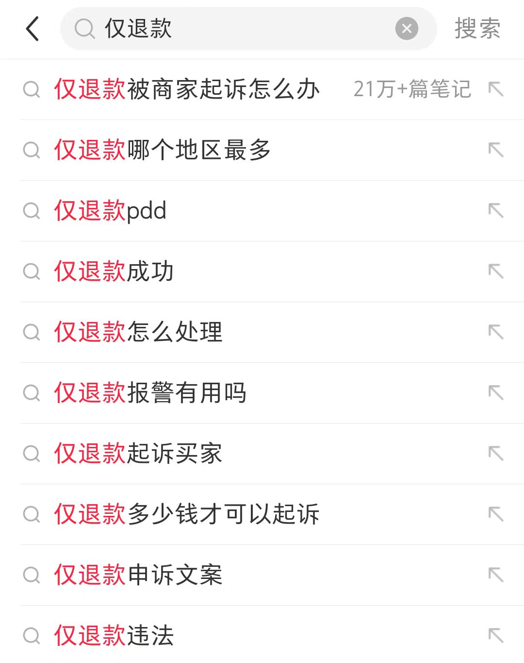 记者在小红书平台上搜索“仅退款”,其中“仅退款被商家起诉怎么办”这一话题相关笔记就达21万+篇。