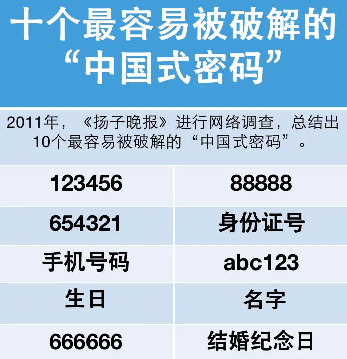 每年年底都会有“十大最容易被猜中的密码”的新闻。为了图方便而设置了最简单的密码,导致一猜就中从而出现安全风险。这份错误密码示范放在今天也不过时,大家一起找找有没有自己的密码: