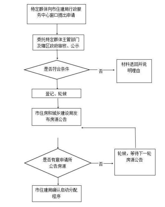 答:当市本级筹集的保障性住房具备入住条件时,由市住建局发布房源公告。经登记有意申请所公告房源的人员,向户口(居住地)所在地社区(街道、办事处)提出房源意向申请,由辖区政府组织逐级审核公示。