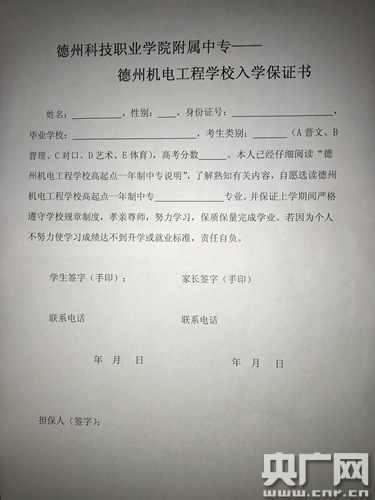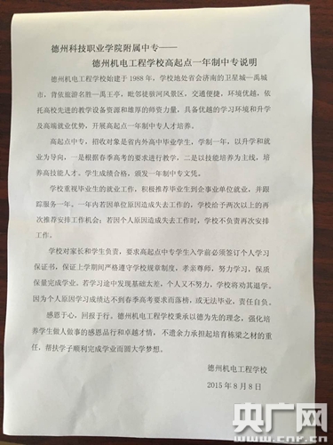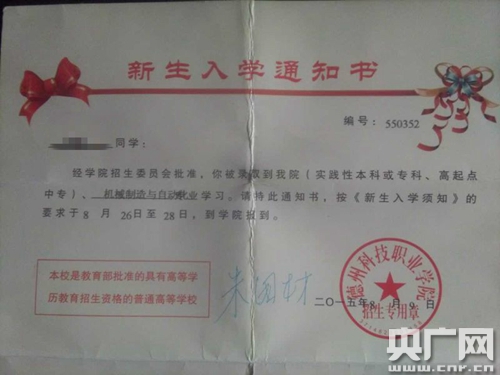 对学生反映的情况,记者联系到了德州科技职业学院,副院长周伟表示,这种高中起点一年制中专是针对部分低分考生的,有国家批准的招生计划,需要在该校先上一年然后来年参加春季高考,“入学通知书”确实不是高考“录取通知书”, “凡是分数线足够了, 正式录取的,我们都会给他们发放录取通知书。而那些分数线不够,又想到我们学校上学的,我们都会给他们一张入学通知书。”