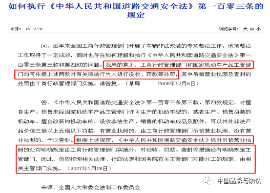 鉴于《道路交通安全法》第一百零三条第四款有“生产、销售擅自改装的机动车”的罚则,对“已取得营业执照擅自改装未经国家机动车主管部门许可改装的车辆的,以及销售擅自改装的车辆的”,应按此罚则处理。所以可以理解为,原工商总局在2004至2006年期间曾主动认领过《道路交通安全法》第一百零三条第四款中涉及“改装机动车”的查处职权。其实,在上述2006年《通知》下发后不久,原工商总局也曾就“改装机动车”的查处职权的问题正式请示过全国人大法工委,但法工委的回复中却对工商部门担负该查处职权的观点不予支持。但此后很长一段时间内,上述《通知》在历年来的规范性文件清理中未被明确废止。