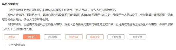 《民法典》第806条为新增条文,系对《最高人民法院关于审理建设工程施工合同纠纷案件适用法律问题的解释》第8条第4项、第9条第2、3项以及第10条第1款的合并整理。本条对特定情况下建设工程合同的法定解除进行了细化规定,以期在给予建设工程合同守约方必要救济,赋予当事人必要的合同解除权的同时,尽力维护建设工程合同法律关系的稳定性。
