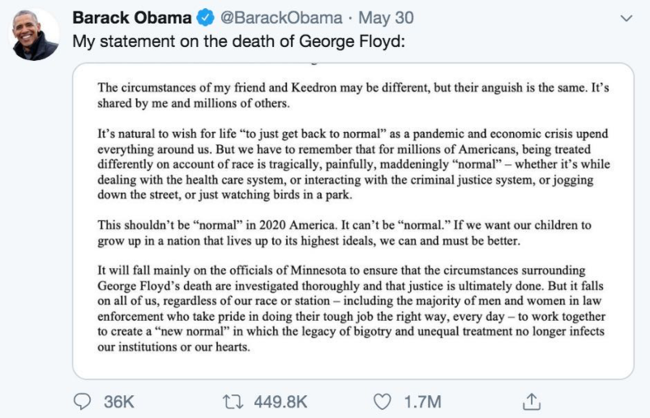 美国前总统奥巴马在社交媒体上发文表示,“弗洛伊德之死”发生在2020年的美国是不正常的。他希望明尼苏达州官员对弗洛伊德的死亡进行“全面调查”,并确保“最终能伸张正义”。他还呼吁创造一个新的环境,“让遗留的偏执和不平等待遇不再侵蚀我们的社会或我们的心”。