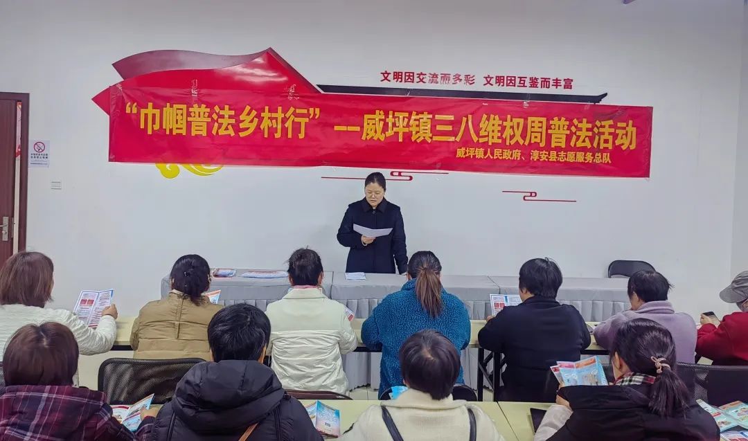 威坪镇妇联联合淳安县志愿服务总队组成巾帼普法宣讲团,在虹桥社区妇女儿童驿站开展“巾帼普法乡村行”——“三八”维权周普法活动。