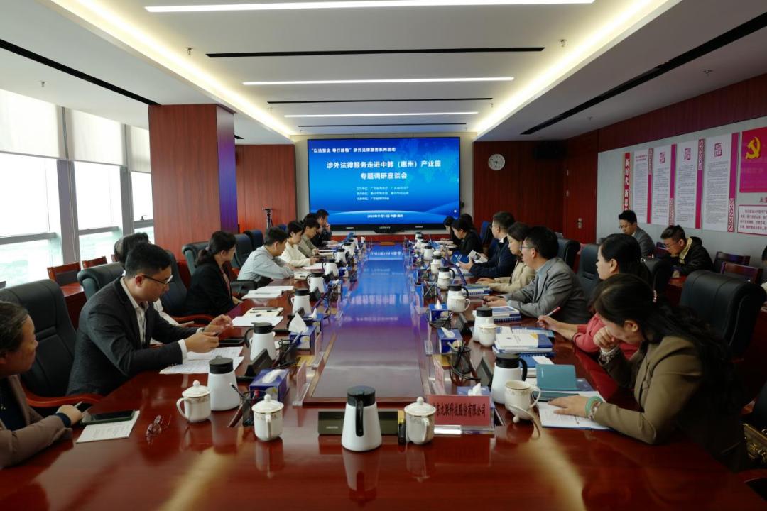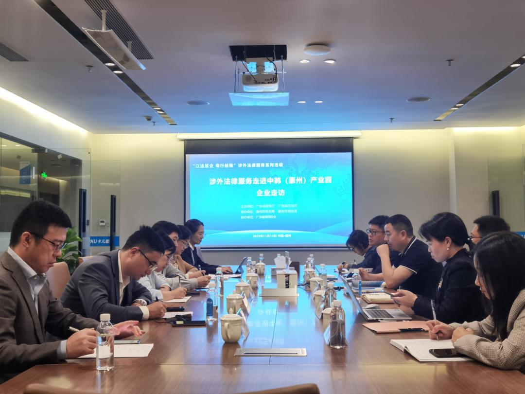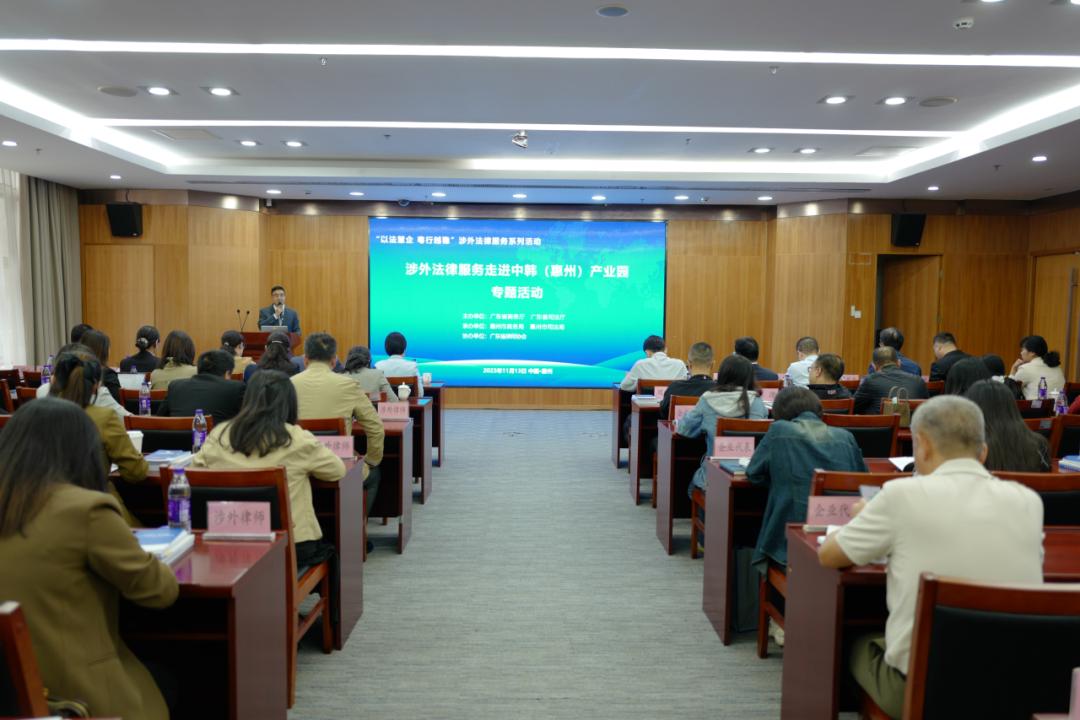为贯彻落实省委“1310”具体部署和全省涉外法治建设工作会议精神,充分发挥我省涉外律师作用,加强涉外法律服务,助力打好外贸、外资、外包、外经、外智“五外联动”组合拳,11月13-14日,由广东省商务厅和广东省司法厅联合主办,广东省律师协会协办,惠州市商务局、惠州市司法局承办的“涉外法律服务走进中韩(惠州)产业园专题活动”在惠州市举办。