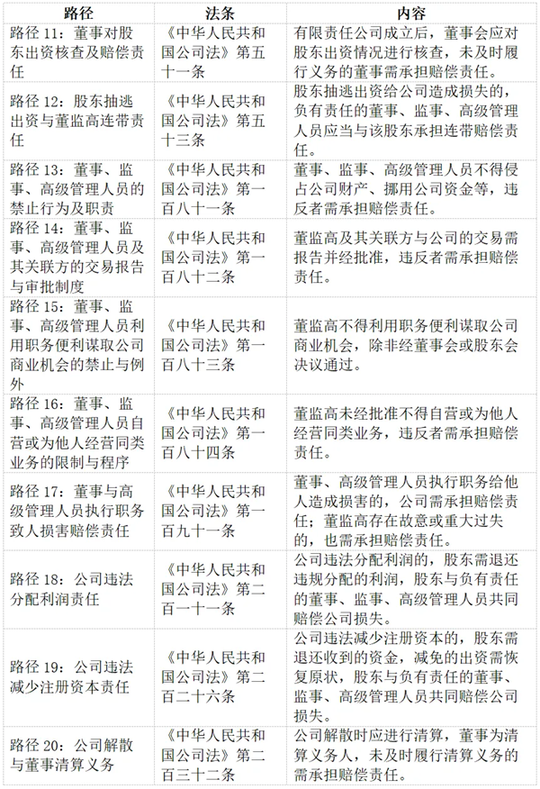 表1:建筑企业追究股东责任10条路径、法条、条款内容列表