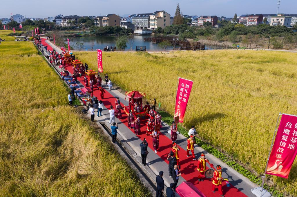 2023年11月3日,浙江省杭州市临平区塘栖镇丁河村举办集体婚礼。八对新人在村民和游客的见证下喜结良缘,并发出《婚俗改革倡议书》。新华社记者 徐昱 摄