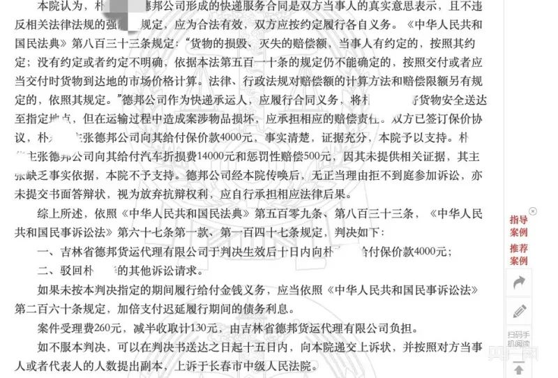 法院判定,德邦快递向朴先生给付保价款4000元(中国裁判文书网截图 央广网发)