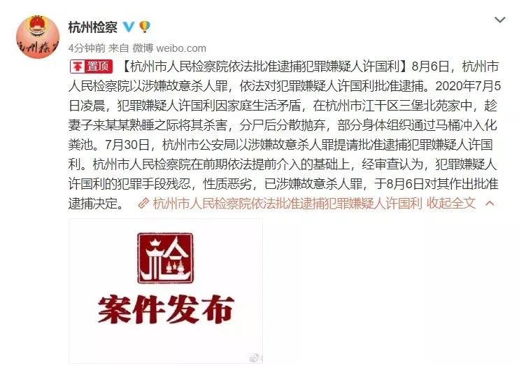 8月6日,杭州市人民检察院以涉嫌故意杀人罪,依法对犯罪嫌疑人许国利批准逮捕。2020年7月5日凌晨,犯罪嫌疑人许国利因家庭生活矛盾,在杭州市江干区三堡北苑家中,趁妻子来某某熟睡之际将其杀害,分尸后分散抛弃,部分身体组织通过马桶冲入化粪池。