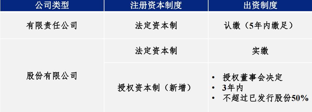 无论是有限责任公司还是股份有限公司都保留了法定资本制。在出资制度方面,有限责任公司由原本的认缴制修改为公司成立后五年内缴足。股份有限公司引入了授权资本制,有别于英美法系的授权资本制和大陆法系的折中资本制,我国公司法规定的授权资本制是公司章程或股东会可以授权董事会在三年内决定发行不超过已发行股份50%的股份。