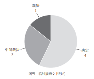 根据《北京仲裁委员会仲裁规则》第62条、第63条,仲裁庭作出的临时措施可以仲裁庭决定、中间裁决或者其他有关法律认可的其他方式作出;紧急仲裁员作出的临时措施可以相关决定、指令或裁决的形式作出。图五显示,在北仲受理的7个临时措施申请案件中,仲裁庭作出的2个临时措施决定均选择了中间裁决的形式;紧急仲裁员作出的5个临时措施决定中,4个选择了紧急仲裁员决定书的形式,1个选择了裁决的形式。