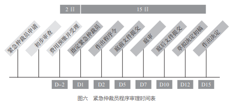 北仲曾于2021825日制定并发布《紧急仲裁员决定自查清单》,其中附件1列举了紧急仲裁员程序审理时间表(见图六),以供紧急仲裁员在组织程序时参考。该审理时间表系以仲裁员为视角的程序安排,其中D1DAY 1)为基准日,即指定紧急仲裁员的当日;D-2即指定紧急仲裁员的前2日,北仲应在当事人完成交费的2日内指定紧急仲裁员;D15即指定仲裁员的第15日,紧急仲裁员最迟应于该日作出紧急仲裁员决定。D1D15之间则涵盖紧急仲裁员可能的各项程序安排,可资借鉴。