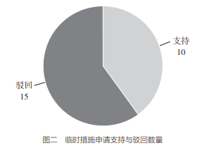需要说明的是,在5个被支持的临时措施案件中,也并非当事人提出的全部临时措施申请事项均被支持。图二显示,如按照临时措施的申请数量统计,在7个案件中,当事人共提出25项临时措施申请,其中10项被支持,15项被驳回。驳回的原因包括但不限于临时措施不具有可行性、临时措施申请过于宽泛、临时措施针对案外第三人等。在前述25项临时措施申请事项中,仅有40%的事项获得支持,这与《ICC关于紧急仲裁员程序的报告》得出的结论相似,其实只有少数的紧急仲裁员和临时措施申请获得了最终的救济。但这本身也许并不令人惊讶:临时救济的性质就决定了只有在特殊情况下,紧急救济才是合理的。