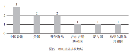 图四显示,上述7个案件25项临时措施涉及的地域包括中国香港(3次)、美国(2次)、开曼群岛(2次)、吉尔吉斯共和国(1次)、蒙古国(1次)、马绍尔群岛共和国(1次)。临时措施会涉及上述国家或地区的主要的原因是相对方的财产所在地、案涉合同标的物所在地位于上述国家或地区。由于被核准的临时措施很可能需要在这些国家或地区执行,上述国家或地区对于仲裁庭或紧急仲裁员作出临时措施的立法和司法态度就显得尤为关键。而中国香港、美国对仲裁庭或紧急仲裁员作出临时措施的支持态度,可能也从另一方面解释了为什么当事人在争议事项涉及上述国家和地区的案件中更愿意提出临时措施申请。