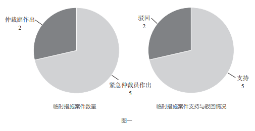 图一显示,自2017918日至20231228日,北仲共受理7个临时措施申请案件,其中2个由仲裁庭处理,5个由紧急仲裁员处理。在7个临时措施申请案件中,有5个案件被支持或部分支持,2个案件被全部驳回。驳回的原因分别是基础管辖权存在严重的不确定性、临时措施申请缺乏紧急性和适度性。