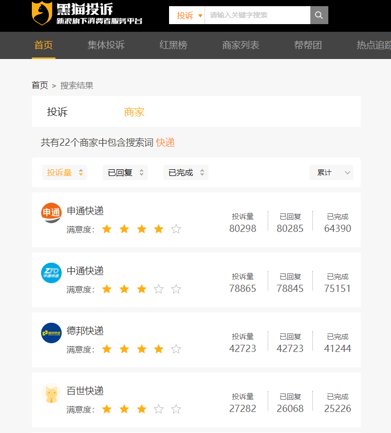鲁网记者在黑猫投诉平台搜索“快递”,出现近124万条相关投诉,其中有不少是投诉快递员未经用户同意,擅自将快递放入驿站、自提柜,且未有任何电话、短信提醒;更有甚者,快递员因未打通收件人电话便以用户拒收为由,擅自将货物退回。投诉对象涉及申通、中通、韵达、圆通、极兔等多家快递公司。其中申通累计投诉量8万余条,位居投诉榜第一。