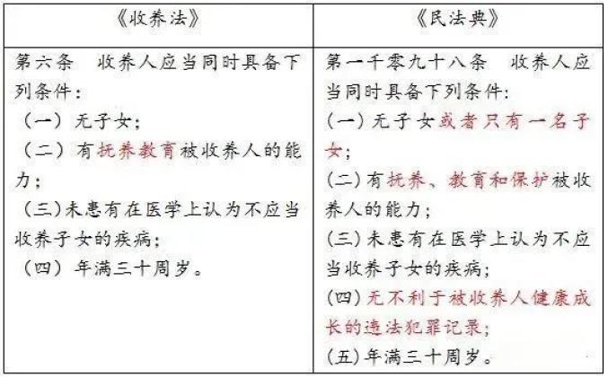 《民法典》第一千零九十八条结合我国的二胎政策,将收养人的条件从“无子女”扩大到“无子女或者只有一名子女”,拓宽了收养人的范围,与现行人口政策一致,有利于促进更多的孤儿被收养,回归到正常的家庭生活中。同时,增加了无不利于被收养人健康成长的违法犯罪记录的要求。如果收养人有违法犯罪的前科,可能会存在对被收养人不利的情况,该条对收养人条件加以限制,有利于避免此类情况发生。
