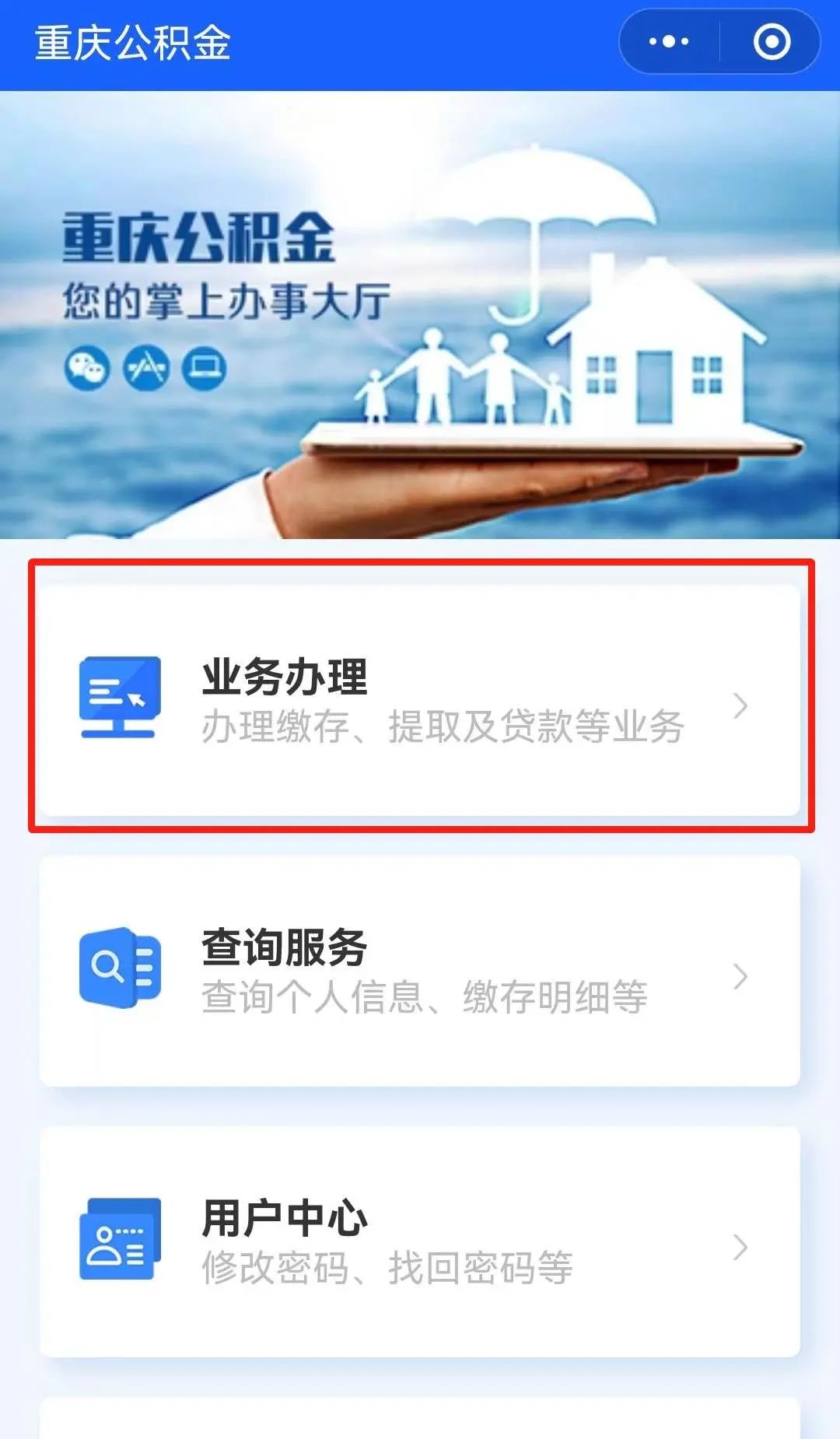 打开微信搜索【重庆公积金】小程序,并根据提示完成注册、登录,登录成功后依次点击【业务办理】—【公贷约定提取签约】。