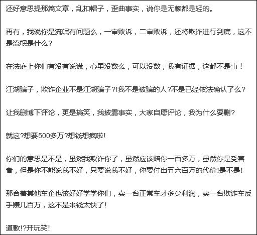 对于特斯拉提出的指控,韩潮在微博发文表示,自己对特斯拉的评价没有问题,因为对方欺诈成立,且已被法院判定败诉。他对特斯拉写道:“你们的意思是不是,虽然我欺诈你了,虽然应该赔你一百多万,虽然你是受害者,但是你不能说我不好,只要说我不好,你要付出五六百万的代价!是不是!”