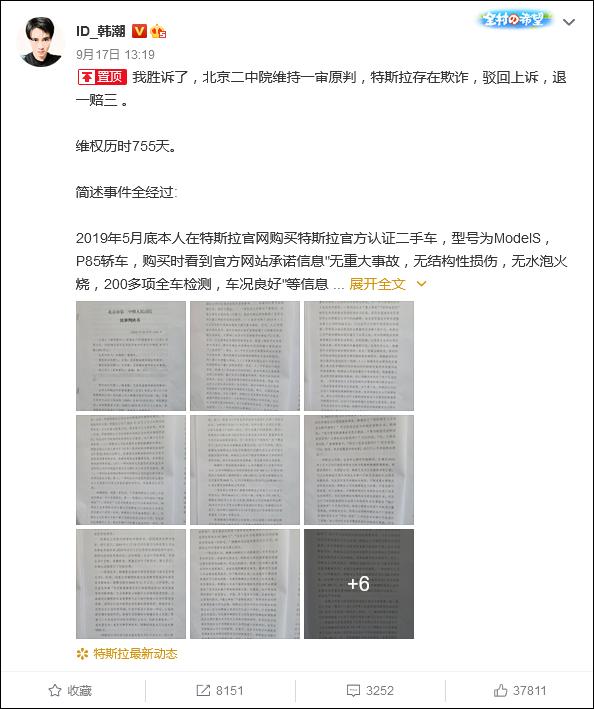 而在今年9月17日,维权车主韩潮在其微博透露,自己和特斯拉的官司二审结果已出,北京市第二中级人民法院宣布维持一审原判,认定特斯拉存在欺诈,退一赔三。此次判决为终审判决。