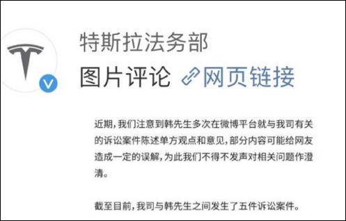 9月27日晚些时候,特斯拉法务部发布声明,回应了公司与韩潮之间所存在的五件诉讼案(包括已结案的二手车纠纷案),韩潮随后也证实和回应了这五起诉讼和特斯拉方面的说法。