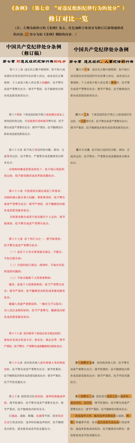 新修订的《中国共产党纪律处分条例》第七章“对违反组织纪律行为的处分”,主要对违反民主集中制原则、违背“四个服从”要求的违纪行为作出处分规定。增加了不按照有关规定或者工作要求向组织请示报告重大问题,不如实报告个人有关事项,篡改、伪造个人档案资料,隐瞒入党前严重错误,党员领导干部违反有关规定组织、参加自发成立的老乡会、校友会、战友会,违规取得国(境)外居留权或者外国国籍,违规办理因私出国(境)证件等违纪条款。
