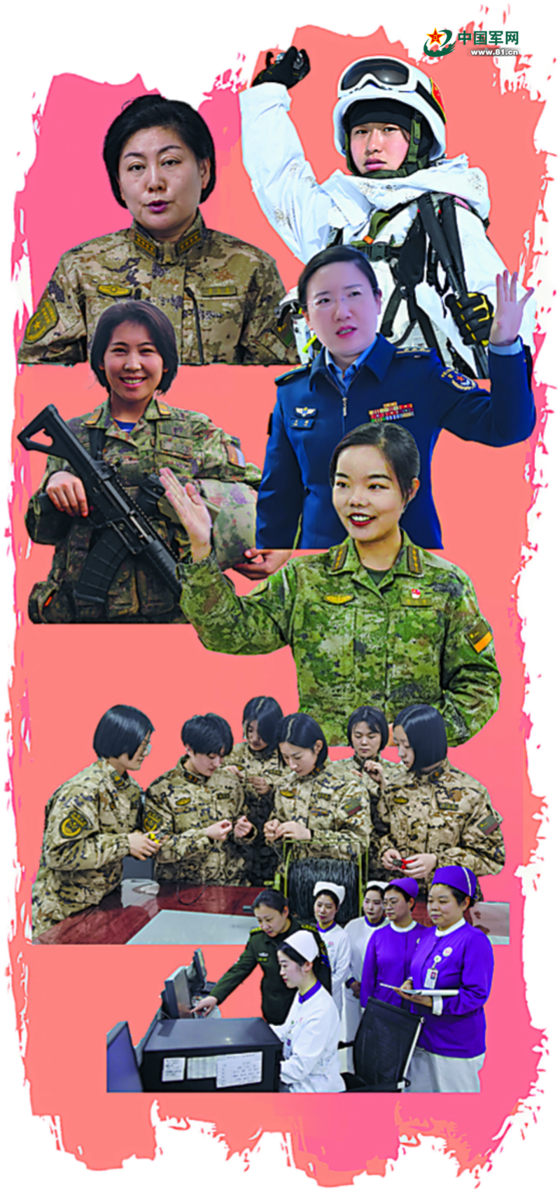 解放军和武警部队部分全国三八红旗手(集体)、全国巾帼文明岗风采。美术设计:石伟