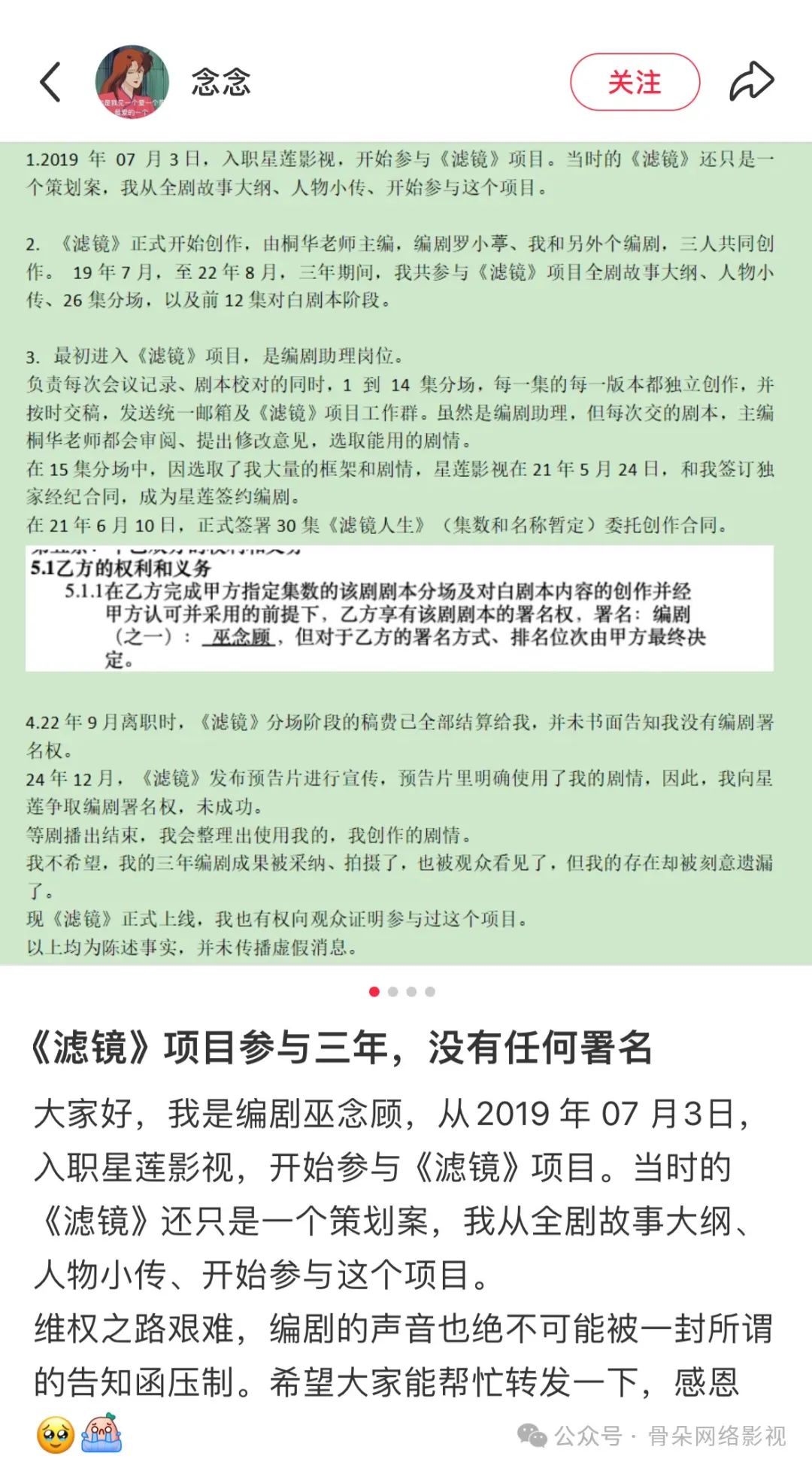 近期,《滤镜》因编剧署名问题登上热搜,编剧巫念顾主张参与了故事大纲、人物小传、分场剧本及部分对白剧本的撰写,但剧集播出后并未获得署名。目前剧方已发布声明回应称对方离职后未完成工作、贡献未达署名标准,但巫念顾依然坚持起诉,并表示并非主动离职且离职时未书面告知其没有署名。