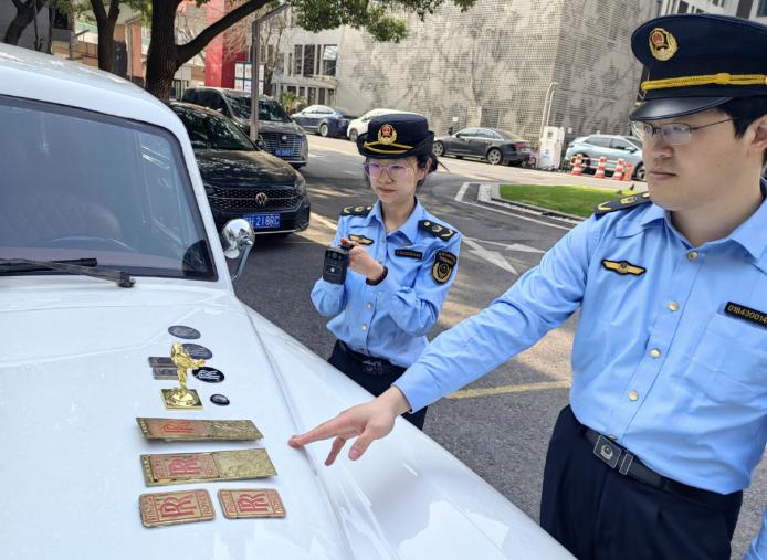 涉案车辆车头的金马车标被替换成“劳斯莱斯飞天女神”车标,车身、轮胎等多处贴有劳斯莱斯“双R”商标。当事人将这些车辆冒充“劳斯莱斯”银云型号车辆作为婚车对外提供租车服务,并在相关网络平台对外宣传。