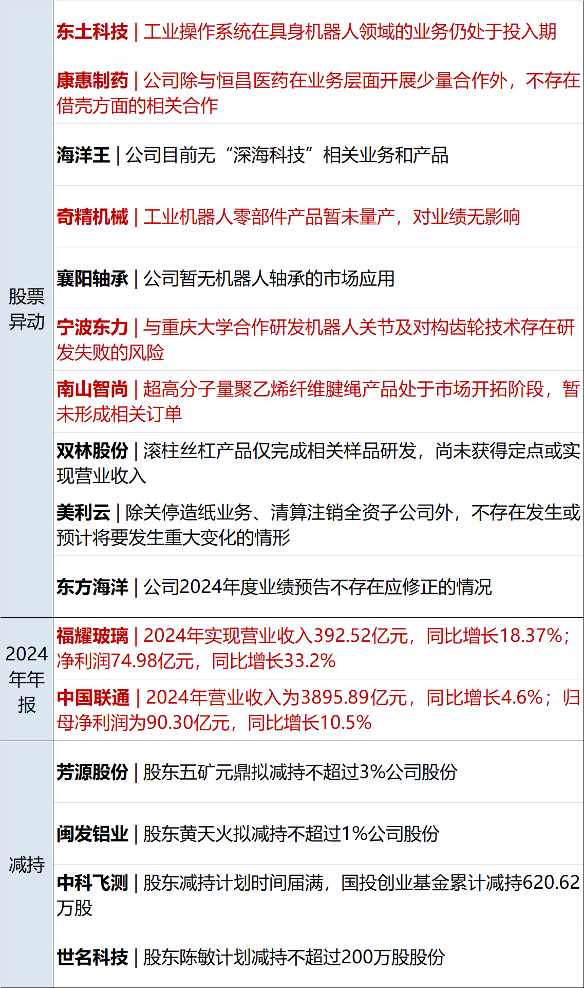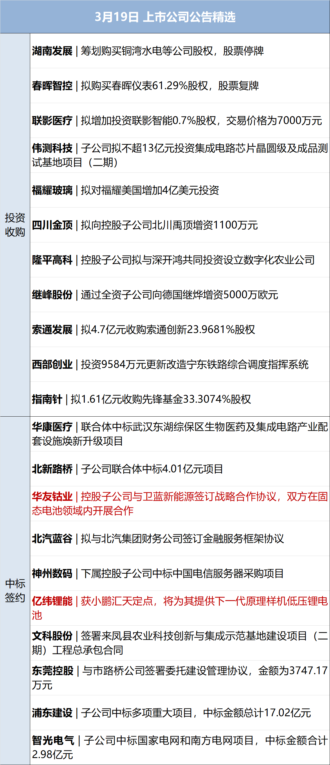 1 隔夜市场 美股三大指数集体收跌,道指跌0.62%,纳指跌304.54点,跌幅1.71%,标普500指数跌1.06%,大型科技股普跌,超微电脑跌超9%,特斯拉跌超5%,英伟达、Meta、博通跌超3%,谷歌跌超2%,微软、亚马逊跌超1%。中概股涨跌不一,纳斯达克中国金龙指数跌0.18%,虎牙直播跌超18%,斗鱼跌逾10%,小鹏汽车、贝壳跌超7%,阿里巴巴、哔哩哔哩跌超3%;老虎证券涨超21%,腾讯音乐涨超15%,蔚来涨超3%,理想汽车、百度小幅上涨。 现货黄金时隔一个交易日再创历史新高,涨1.13%,报3034.42美元/盎司,盘中最高报3038.31美元/盎司;COMEX黄金期货涨1.18%,报3041.7美元/盎司,再创新高。COMEX白银期货涨1%,报34.65美元/盎司。 国际油价全线下跌,美油5月合约跌1.17%,报66.58美元/桶。布油5月合约跌1.01%,报70.35美元/桶。 欧股主要指数收盘普涨,德国DAX30指数涨1.06%,英国富时100指数涨0.3%,法国CAC40指数涨0.5%,欧洲斯托克50指数涨0.7%。 2 证监会发布!重要新规征求意见 据证监会网站,3月18日,中国证监会发布关于就《中国证监会派出机构监管职责规定(修订草案征求意见稿)》公开征求意见的通知。文件涉及多项内容,包括明确派出机构对公开发行股票并上市辅导工作的监管职能,优化私募基金风险处置机制,授权派出机构依法推动相关主体适用先行赔付制度等。意见反馈截止时间为2025年4月16日。 3 长江和记出售海外港口,外交部回应 据外交部网站,3月18日,外交部发言人毛宁主持例行记者会。法新社记者提问,有报道称,在长江和记集团同意出售在巴拿马业务后,中国政府正就该集团出售海外港口对其开展调查。外交部能否证实并提供更多细节?“有关具体情况请向主管部门询问。作为原则,我想强调,中方一贯坚决反对利用经济胁迫、霸道霸凌侵犯损害他国正当权益的行为。”毛宁说。 外交部:中方将坚定维护中国企业的合法权益 外交部发言人毛宁主持3月18日举行的例行记者会。有记者问:美国商务部表示,禁止在政府设备上使用DeepSeek,对此有何评论?毛宁表示,中方一贯反对泛化国家安全概念,将经贸科技问题政治化,我们也将坚定维护中国企业的合法权益。(央视新闻) 4 王毅将出席中日韩外长会并主持第六次中日经济高层对话 3月18日,外交部官网消息,外交部发言人宣布:中共中央政治局委员、外交部长王毅将出席3月22日在日本东京举行的第11次中日韩外长会。在日本期间,还将同日本外相岩屋毅共同主持第六次中日经济高层对话。 5 中国人民银行行长潘功胜会见淡马锡董事长林文兴及董事会成员一行 据中国人民银行网站,3月18日,中国人民银行行长潘功胜会见了淡马锡董事长林文兴及董事会成员一行,双方主要就中国宏观经济形势和货币政策等议题进行了交流。 6 利好来了!五部门联合印发通知 据国家发改委网站,3月18日,国家发展改革委等五部门印发的《关于促进可再生能源绿色电力证书市场高质量发展的意见》正式公布。其中提出,明确绿证强制消费要求。依法稳步推进绿证强制消费,逐步提高绿色电力消费比例并使用绿证核算。《意见》还给出了激发绿证消费需求、完善绿证交易机制、拓展绿证应用场景、推动绿证应用走出去等一系列政策安排。 7 将赋能人工智能 我国首个数据标注产业规划发布 我国首个数据标注产业专项规划《合肥数据标注产业发展规划(2025—2027年)》近日正式发布。数据标注产业是对数据进行筛选、清洗、分类、注释、标记和质量检验等加工处理的新兴产业。培育壮大数据标注产业对于提升数据供给质量,推动人工智能创新发展具有重要支撑作用。专家表示,未来三年,将构建教育、医疗、工业、科技创新等11个领域的高质量数据集,形成3000TB的数据量、30亿的产值,赋能千亿的人工智能和数字化转型。(央视新闻) 8 严打侵犯公民个人信息犯罪!公安部公布10起典型案例 2024年,按照公安部统一部署,全国公安机关深入推进“净网”专项行动,始终保持对侵犯公民个人信息犯罪的高压严打态势,紧盯信息获取、信息倒卖、信息使用等关键环节,重拳捣毁一批个人信息交易平台,坚决斩断侵犯公民个人信息犯罪链条,有力维护了公民合法权益和信息安全。全年,共侦破相关案件7000余起,抓获一批犯罪嫌疑人。今年3月18日,公安部公布依法打击侵犯公民个人信息犯罪案例。包括北京海淀公安机关侦破刘某等人侵犯公民个人信息案、甘肃张掖公安机关侦破“1·23”侵犯公民个人信息案、吉林长春公安机关侦破王某明等人侵犯公民个人信息案等10起典型案例。(央视新闻) 9 大回暖!升温20℃!这些地方注意! 3月18日至周末,我国大部地区气温持续回升,周末气温会达到高点,最高气温20℃线将推进到东北地区南部,但昼夜温差较大。回暖的同时,我国大部地区降水稀少,未来三天,我国的雨雪天气主要集中在西南地区一带,西藏东部、川西高原局地有大到暴雪。(央视财经) 10 国际新闻 特朗普:与普京通话“非常好且富有成效” 希望结束俄乌冲突 当地时间3月18日,美国总统特朗普在其社交媒体平台“真实社交”上发文表示,他当日与俄罗斯总统普京的电话交谈“非常好且富有成效”。他表示,双方同意俄乌同时放弃袭击对方能源基础设施的提议,且同意将迅速努力实现全面停火,最终结束俄罗斯和乌克兰之间的冲突。特朗普表示,双方讨论了和平协议的许多要素,俄罗斯总统普京和乌克兰总统泽连斯基都希望
