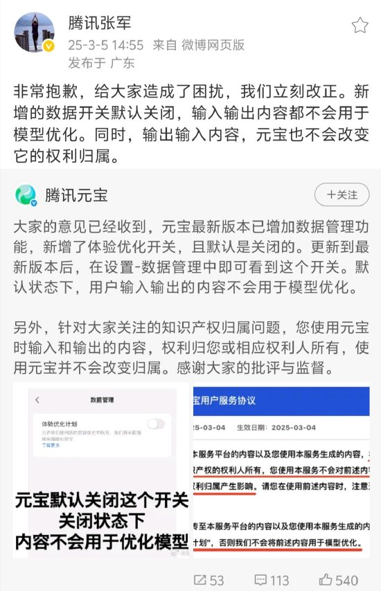 张军表示:“非常抱歉,给大家造成了困扰,我们立刻改正。新增的数据开关默认关闭,输入输出内容都不会用于模型优化。同时,输出输入内容,元宝也不会改变它的权利归属。”