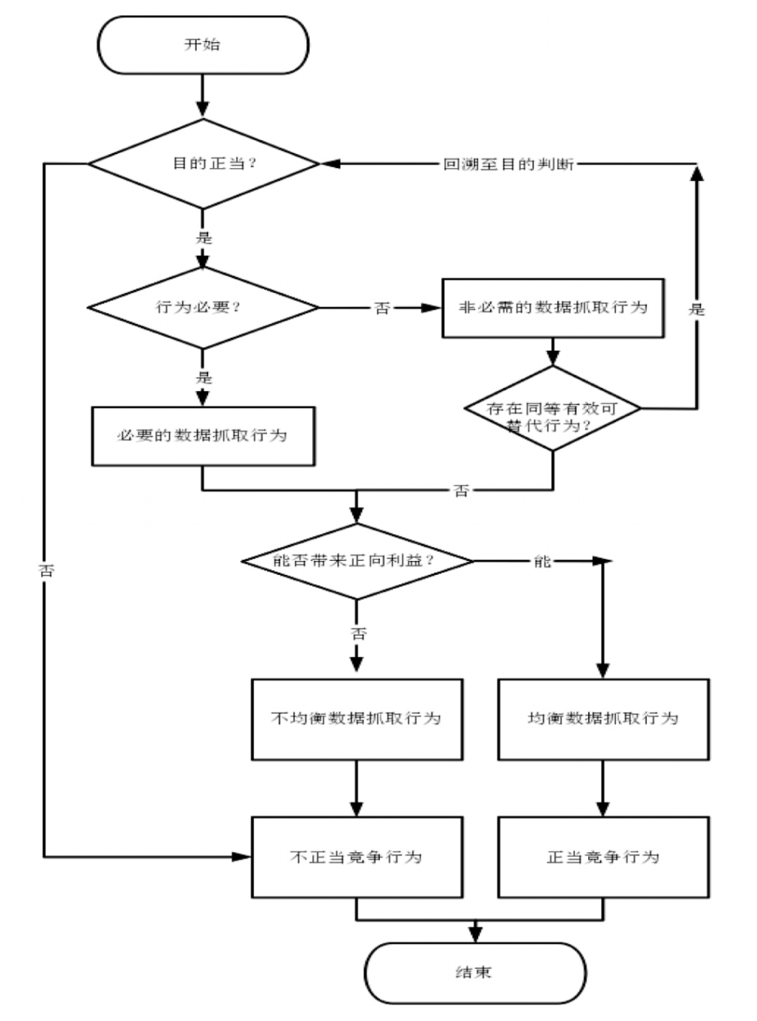 正因比例原则的优势所在,因此有必要在审理数据抓取类不正当竞争案件当中建立和适用以比例原则为核心的行为正当性客观判断范式。而这一司法判断的进路便在于:第一,被诉数据抓取行为是否在目的上正当;若正当则继续判断下一步,反之则判定数据抓取行为系属不正当竞争行为;第二,被诉数据抓取行为是否是被告人所必须采取的;如果是其所必须采取的行为,那么手段是否适当即被诉数据抓取行为对反不正当竞争法所保护的利益造成损害时,能否带来同等乃至远超的可抵消的社会利益,若能带来正向利益则可判定其行为具有均衡性,反之则不均衡;第三,如果不是被告人所必须采取的行为,那么是否存在同等有效但损害性更小的可替代行为;如果存在则被诉数据抓取行为系属不正当竞争行为,反之则判定其行为具有均衡性,如图1。