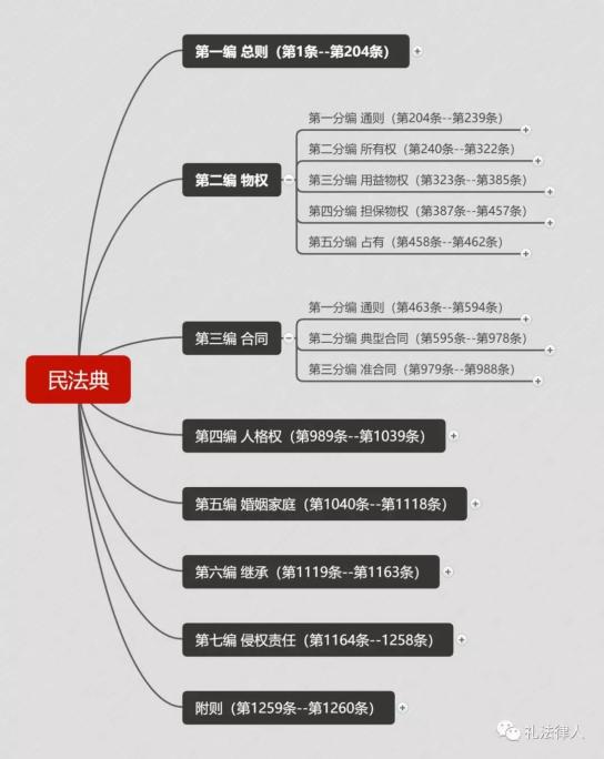 《民法典》共7编,依次为:总则编、物权编、合同编、人格权编、婚姻家庭编、继承编、侵权责任编,以及附则。