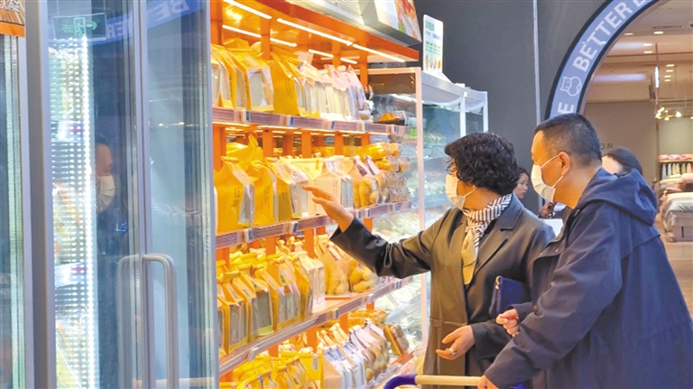 3月14日,消费者在盒马鲜生曲江银泰城店选购商品。 记者 齐珂雨摄