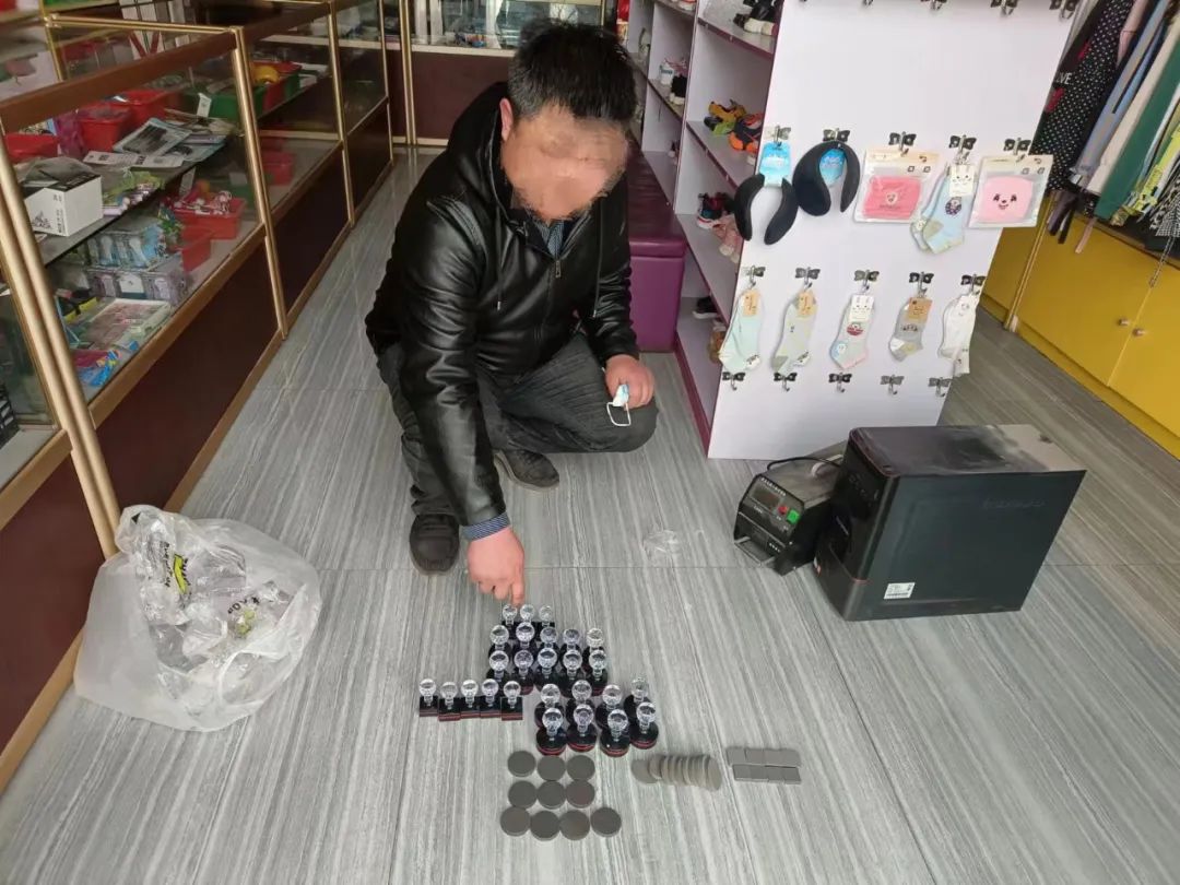 2022年4月8日,永宁县公安局望洪派出所对辖区开展安全检查时,发现望洪镇某街道一店内在未取得公章刻制业特种行业许可证的情况下刻制印章,并当场在其店内查获空白印章模具26枚、印章垫子28个、光敏印章机1台、电脑主机1台,民警依法对刻章店人员张某某进行传唤调查。