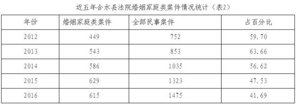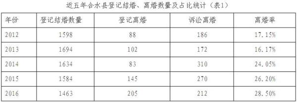 返还彩礼属于婚约财产纠纷,主要发生在解除婚约、离婚纠纷或同居关系纠纷过程中。通过对合水县婚姻登记机关近五年登记结婚和登记离婚情况的调查,综合法院诉讼程序办理离婚案件的分析,全县的离婚率逐年上升,成为影响社会稳定的一大因素(见表1)。