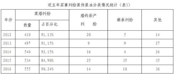 近五年法院审理的家事纠纷占民事案件的绝大部分(详见表2),其中离婚纠纷在家事纠纷中占90%左右(见表2)。在历年离婚纠纷案件中,约有10%的案件涉及彩礼返还纠纷一并调解解决,单独以婚约财产纠纷案由立案的案件数量并不太多(见表3)。因彩礼返还以解除婚约、离婚或解除同居关系为前提,“赔了夫人又折兵”,当事人矛盾往往比较尖锐,案件审理难度较大。能否将这类矛盾尖锐的案件办理的合法合情合理,是对办案法官业务水平的一个考验。
