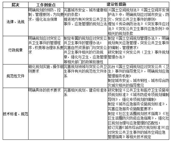 当前,规划如何根据预防、处置突发事件的需要,统筹布局必需的公共服务设施、基础设施,合理配置应急服务设施等,仍然缺乏必要的法律法规、标准规范和细则要求。应在国土空间规划的立法过程中,明确应对突发公共事件的规划原则,确定相关专项规划的编制、审批、内容、监督实施和法律责任等要求,以及相应的强制性建设标准,强化规划基础要求的刚性管理和应对不确定性问题的弹性预留。在法律法规层面,强化法治保障,明确规划的预防、控制、管理原则;通过专项规章,进一步明确规划应对突发公共卫生事件中的管理程序、权责等治理体系,强化与卫生、应急管理领域的衔接性;同时,配套完善规划相关的实施细则、指导意见,落实具体的操作政策;通过制定、完善相关技术标准、规范,强化技术管理依据。如,适时出台《国土空间规划应对突发公共(卫生)事件的指导意见》等规范性文件;抓紧研究制定《公共卫生和医疗卫生设施专项规划标准》《城市应急服务设施规划标准》,修订完善《城市综合防灾规划标准》等相关技术规定。(表3)
