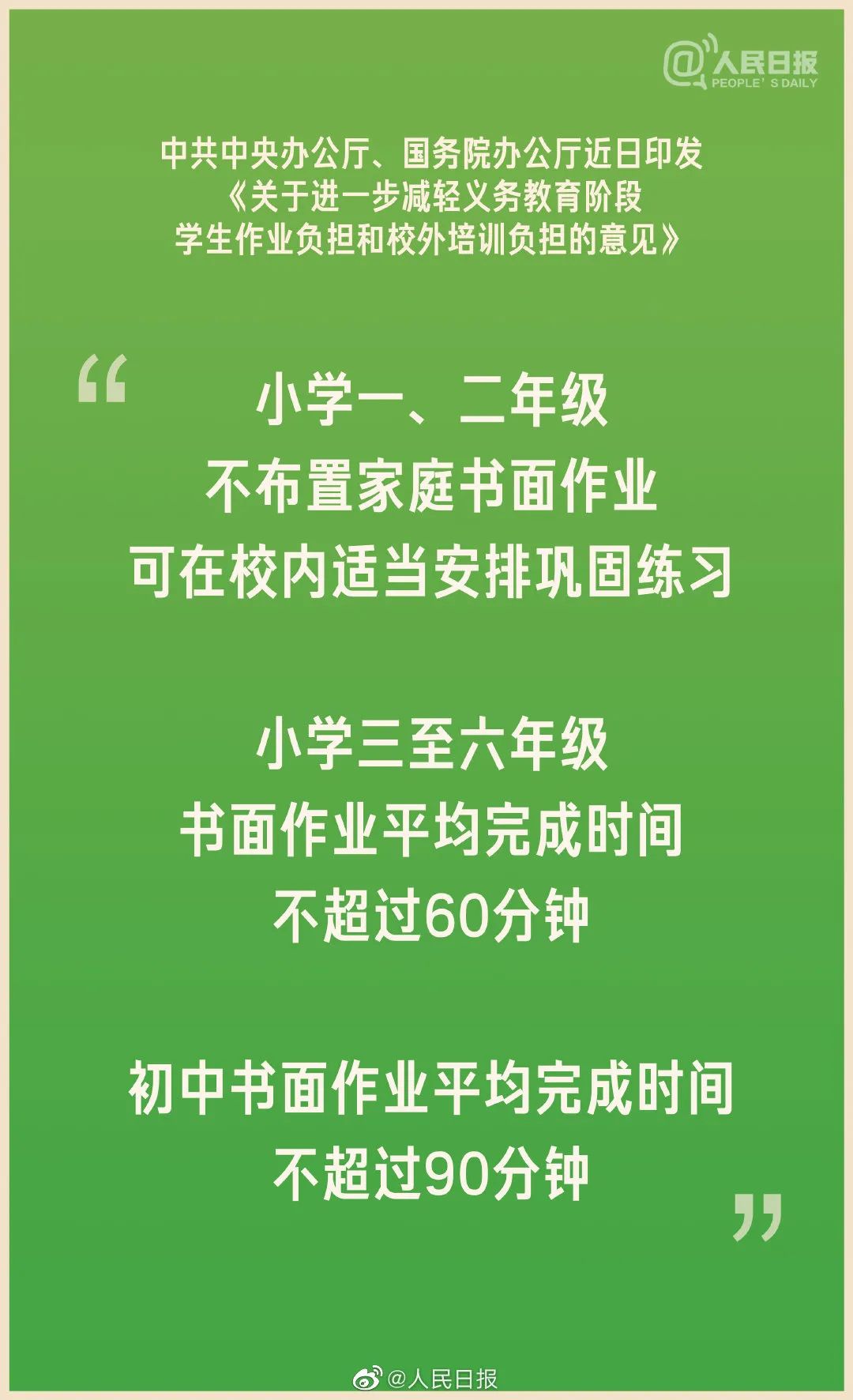 近日,中共中央办公厅、国务院办公厅印发《关于进一步减轻义务教育阶段学生作业负担和校外培训负担的意见》。《意见》明确提出“双减”工作目标:学生过重作业负担和校外培训负担、家庭教育支出和家长相应精力负担1年内有效减轻、3年内成效显著,人民群众教育满意度明显提升。