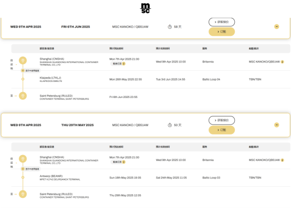 地中海航运网站上仍然显示到俄罗斯圣彼得堡的船期